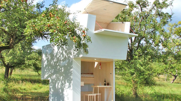 Είναι επενδεδυμένο με ξύλο και δένει άψογα με τη φύση. Στο εσωτερικό της, η μικροσκοπική αυτή κατοικία διαθέτει όλες τις βασικές ανέσεις ενός σπιτιού. Ενσωματωμένα ράφια και συρτάρια για την αποθήκευση τροφίμων, βιβλίων, εργαλείων κηπουρικής κλπ. Η πίσω πλευρά του διπλώνει, δημιουργώντας ένα αίθριο και ένα ανοιχτό σαλόνι.