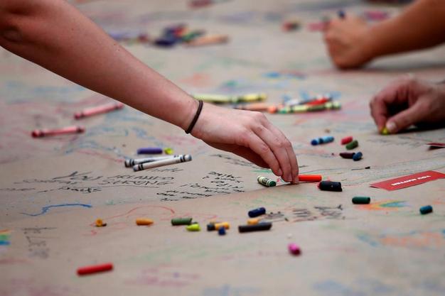 Πολίτες χρησιμοποιούν κραγιόνια για να αφήνουν μηνύματα για τους νεκρούς μπροστά από το φως των κεριών σε αγρυπνία στην μνήμη των θυμάτων μια ημέρα μετά τους μαζικούς πυροβολισμούς στο γκέι κλαμπ Pulse στο Ορλάντο, στην Φλόριντα, στις 13 Ιουνίου 2016. ADREES LATIF / REUTERS